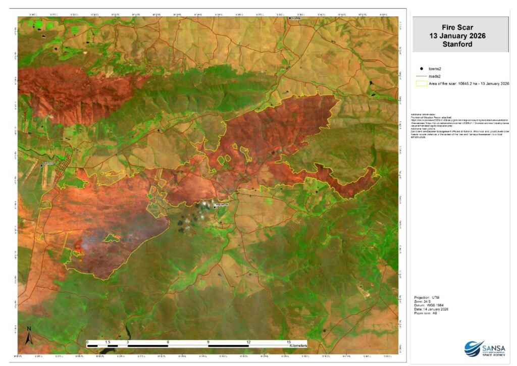 The Stanford fire scar displays a large, continuous burned area with pronounced spatial heterogeneity. High burn impact zones are concentrated in the central and western sections of the scar, while lower-intensity or patchier burn patterns are observed toward the periphery. The fire affected both natural vegetation and cultivated lands, reflecting fuel continuity across land-use types. The burn perimeter intersects multiple transport corridors, indicating potential disruption to infrastructure during the fire event. Overall, the spatial extent and configuration of the scar suggest rapid fire propagation under favourable burning conditions on 13 January 2026.