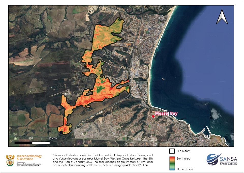 The map below shows the extent and severity of a wildfire near Mossel Bay along the southern coast of South Africa. Burnt areas are highlighted in red to orange, unburnt areas in green, overlaid on satellite imagery. The fire affected parts of Asandrif, Island View, and Vleesbaai during January 2026, with the mapped burn scar covering roughly 6.4 km². Nearby urban areas and infrastructure are visible, showing how close the fire came to settlements. The data is derived from Sentinel-2 satellite imagery and presented by SANSA.