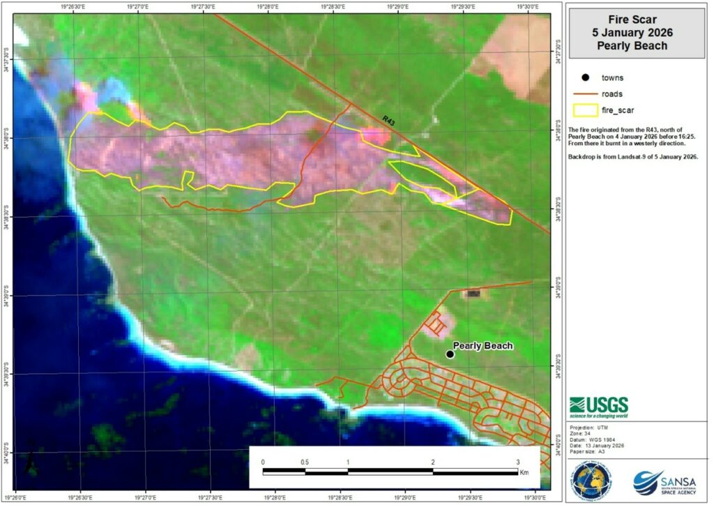 The mapped burn scar from Pearly Beach reveals a continuous and elongated fire footprint extending parallel to the coastline, with the highest burn intensity concentrated in the central and eastern portions of the affected area. The spatial pattern suggests wind-driven fire spread, with the scar widening in areas of continuous natural vegetation and narrowing near infrastructure corridors. Although the fire perimeter approached the outskirts of Pearly Beach, the burned area largely remained outside the urban footprint, indicating limited direct impact on residential zones. The burn scar geometry and alignment are consistent with regional topography and prevailing coastal wind conditions during the January 2026 fire event.