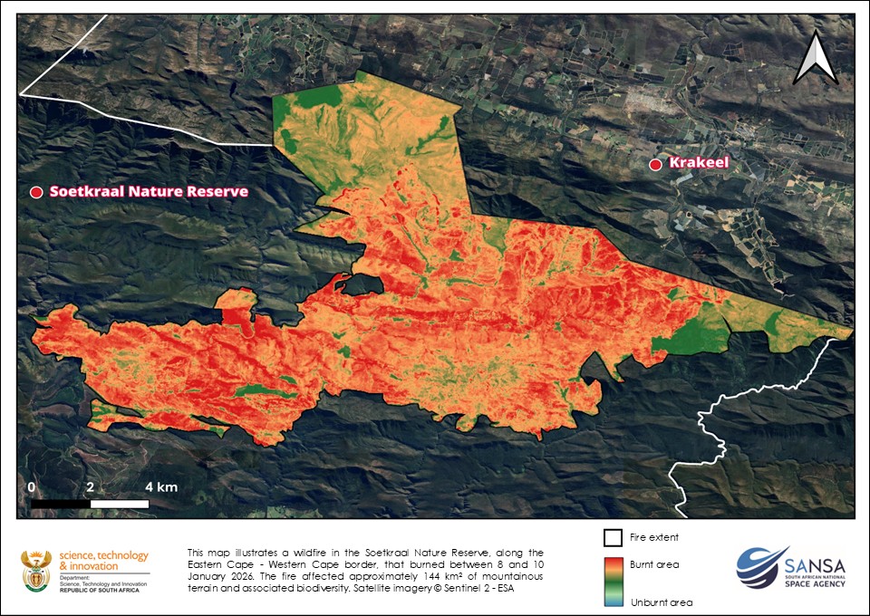 The proximity of the burn scar to key landmarks, including the Soetkraal Nature Reserve and nearby settlements such as Krakeel, emphasizes the ecological and socio-environmental significance of the event. The mapped fire footprint covers approximately 144 km², indicating a large-scale disturbance with potential implications for biodiversity, soil stability, and post-fire erosion processes.